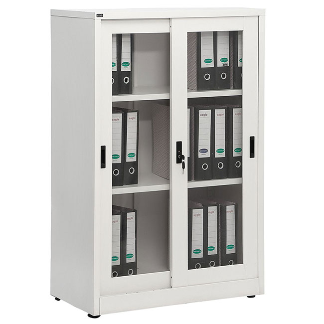 HomeOffice & Industrial FurnitureCupboardsSliding DoorGlass Sliding Door Cupboard with 2 Shelves Glass Sliding Door Cupboard with 2 Shelves Category: Sliding Door Description Product Description 2 Shelves Glass Sliding Door CupboardColour : Powder Coated Grey Features :- Dual Purpose Shelves – These can accommodate box files as well as lateral pocket files40 kg load carrying capacity per shelfAdjustable Shelves – Easily adjustable shelves at 20 mm pitch40 kg load carrying capacity per shelfPlastic handle locking with fold-able keysSmooth Sliding rails. Dimensions :- Share this Related products Glass Sliding Door Cupboard with 1 Shelf Glass Sliding Door Cupboard with 4 shelves Metal Sliding Door Cupboard with 2 Shelves