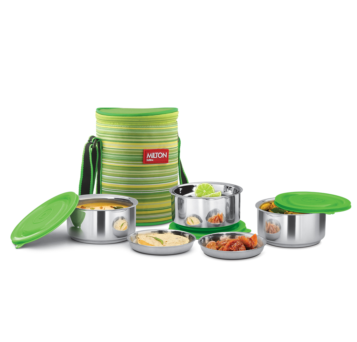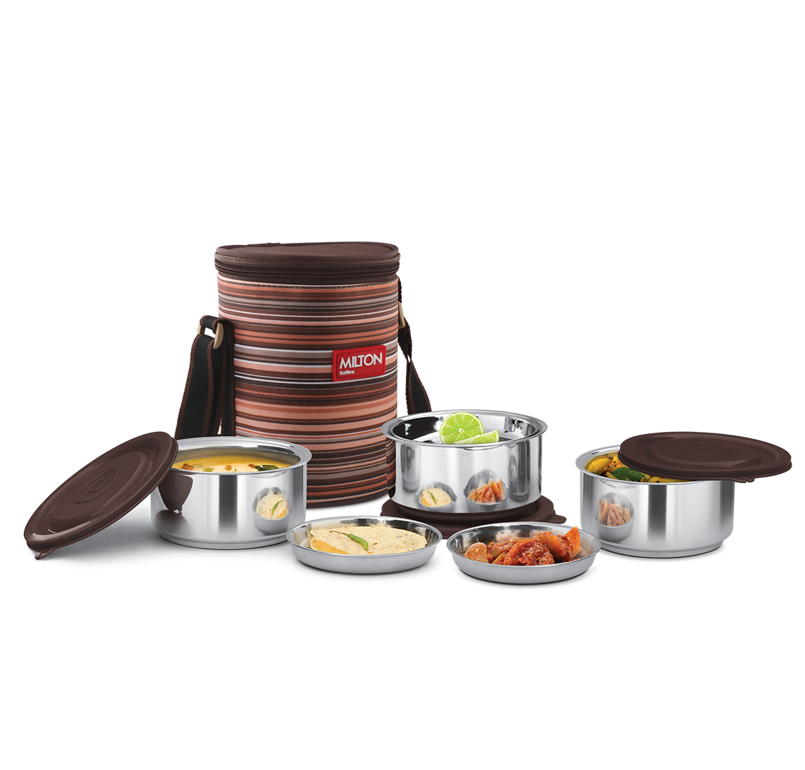 Ribbon Lunch Box 3 comes with double walled stainless steel insulated containers which keeps your food fresh and warm for longer hours. They also have a plate on top for serving accompaniments to make your meal tastier. The tiffin is ideal for offices, workplaces, schools and colleges.